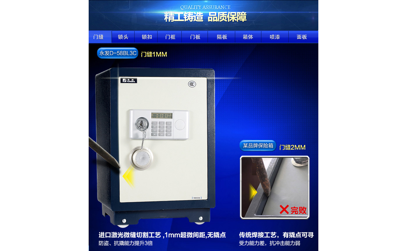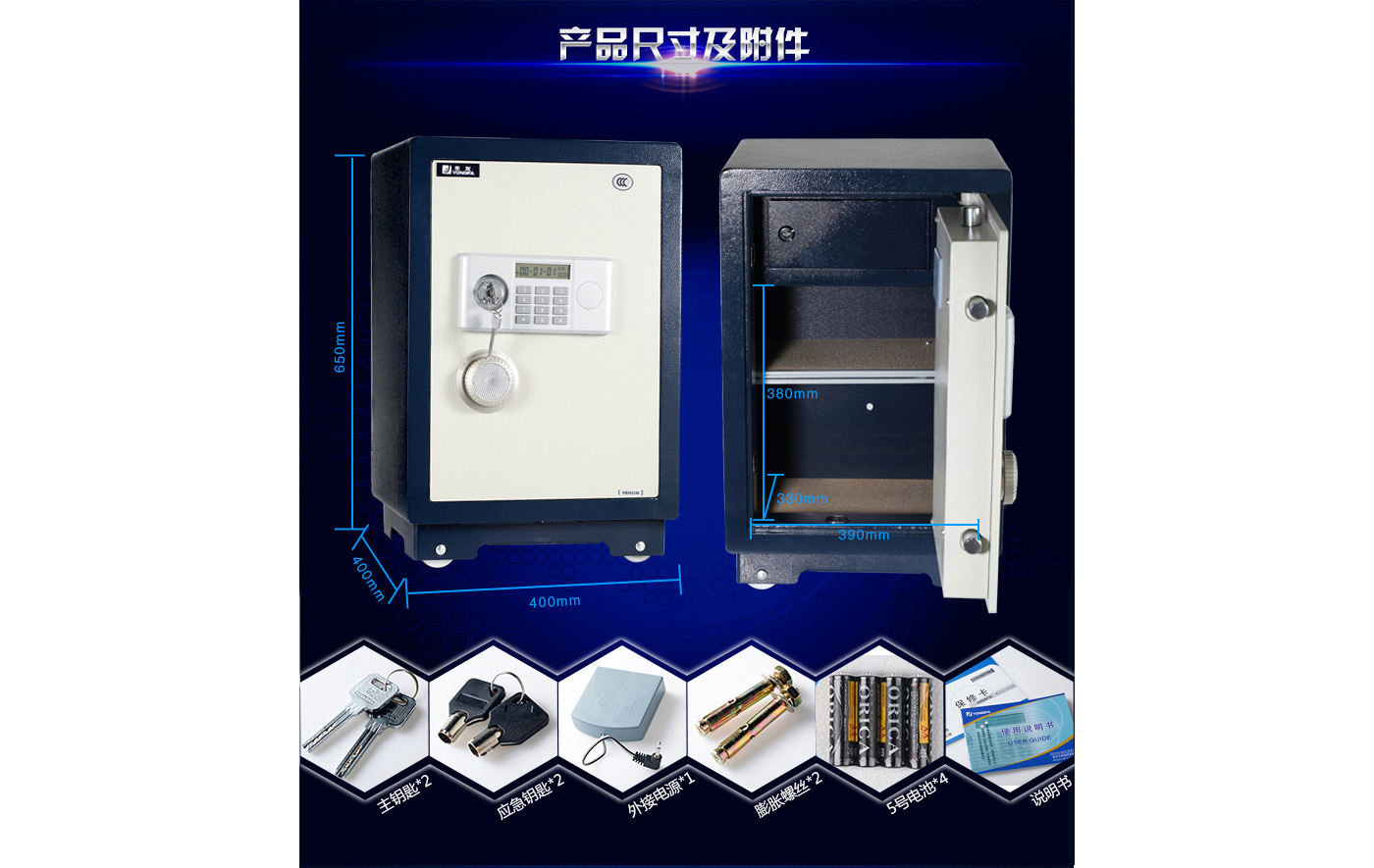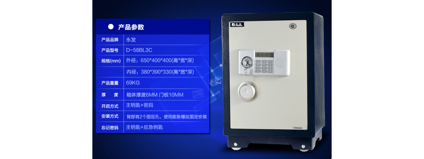 永發(fā)經(jīng)典電子系列3C認(rèn)證保險(xiǎn)箱D-58BL3C尺寸說明:650高*400寬*400深mm(含底座) 重量:69kg