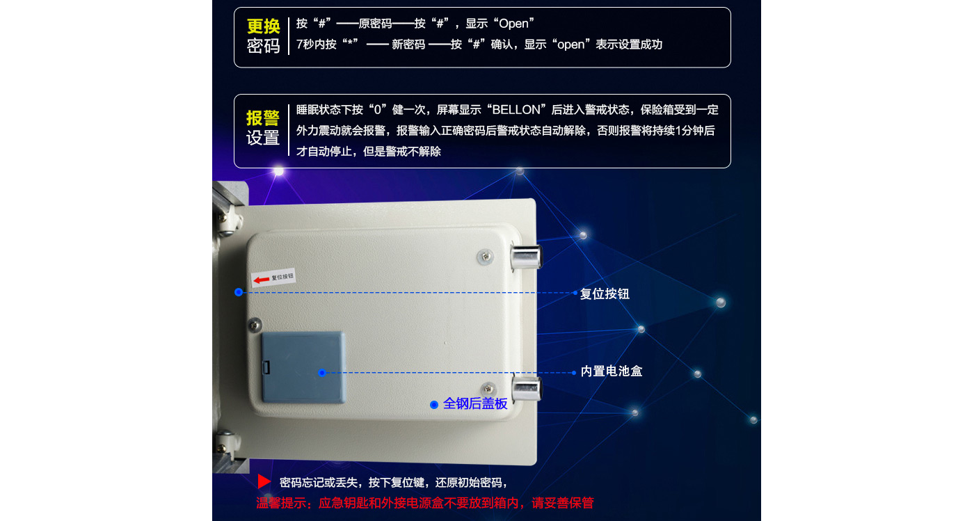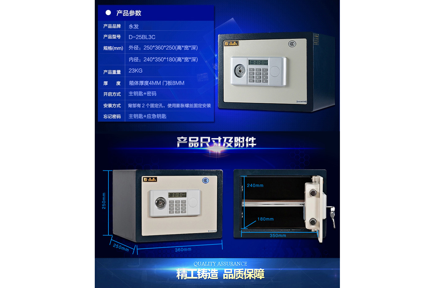 永發(fā)經(jīng)典電子系列3C認(rèn)證保險(xiǎn)箱D-25BL3C尺寸說明:250高*350寬*250深mm(含底座) 重量:23kg