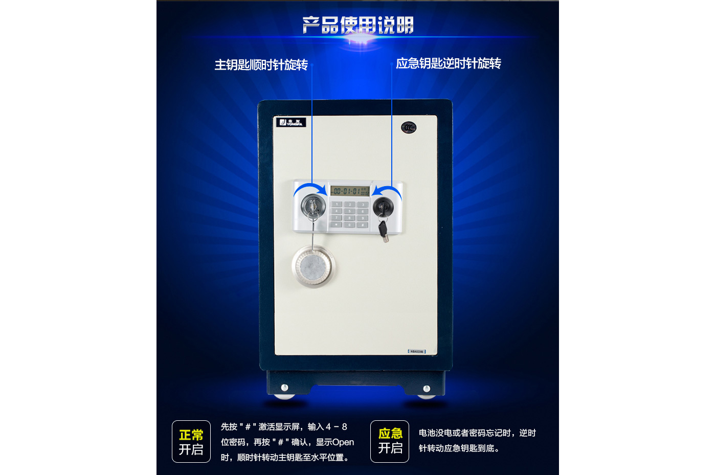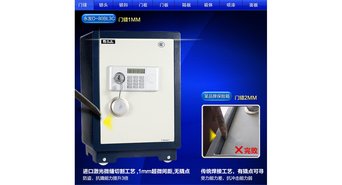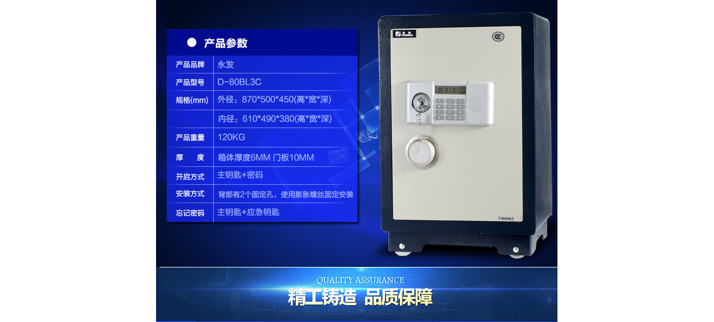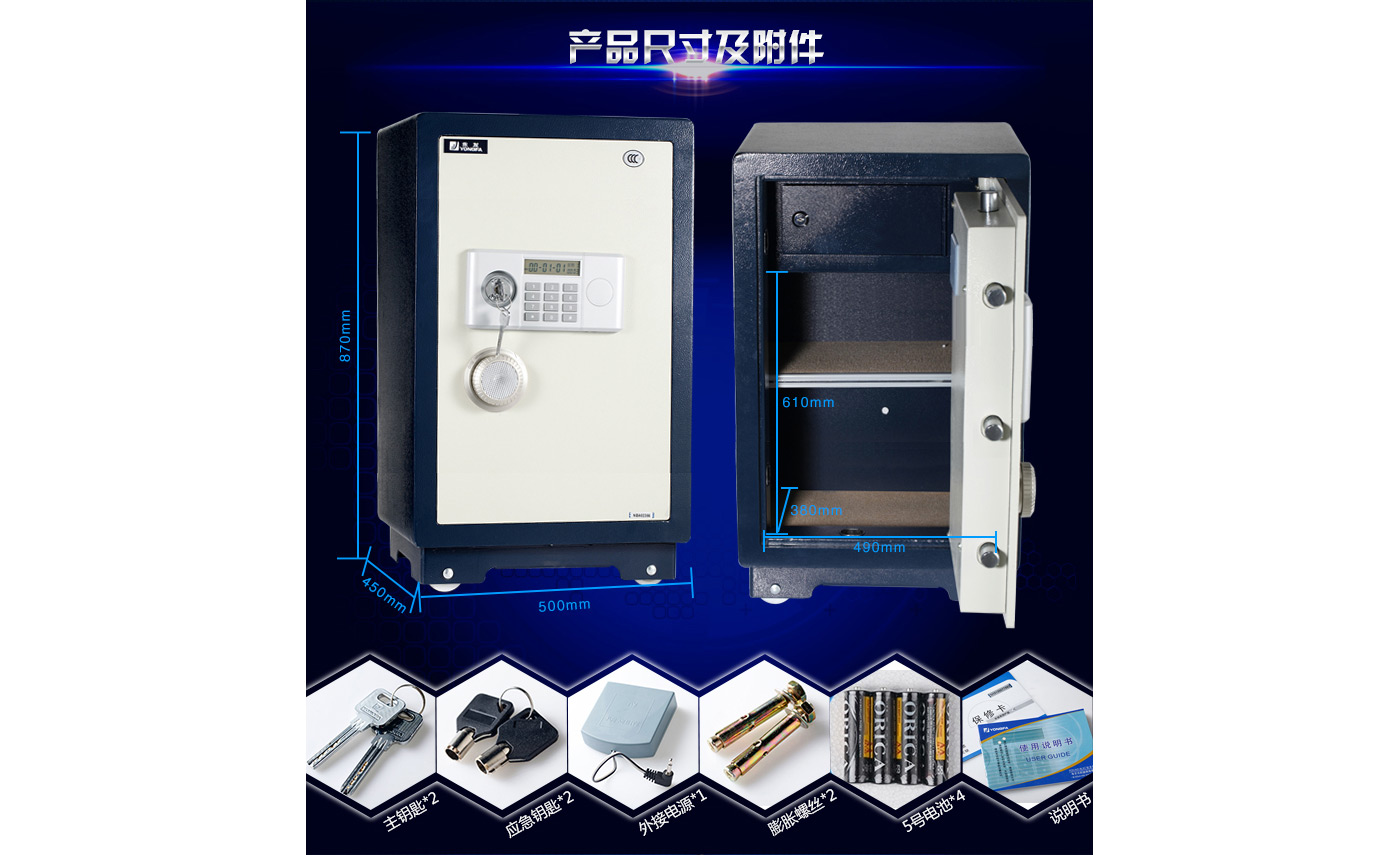 永發(fā)經(jīng)典電子系列3C認(rèn)證保險(xiǎn)箱D-80BL3C尺寸說(shuō)明:870高*500寬*450深mm(含底座) 重量:120kg