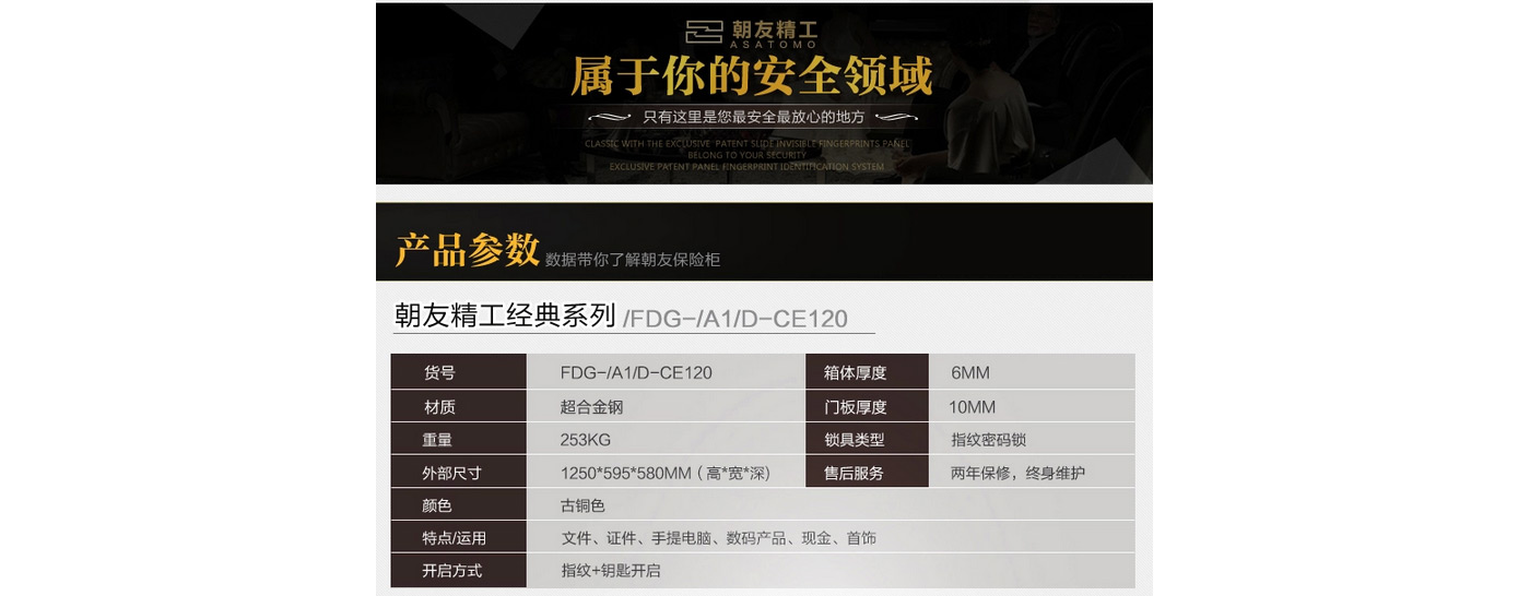 永發(fā)旗下朝友CE120經典指紋3C保險柜尺寸說明:1250高*595寬*580深mm(含底座) 重量:253kg