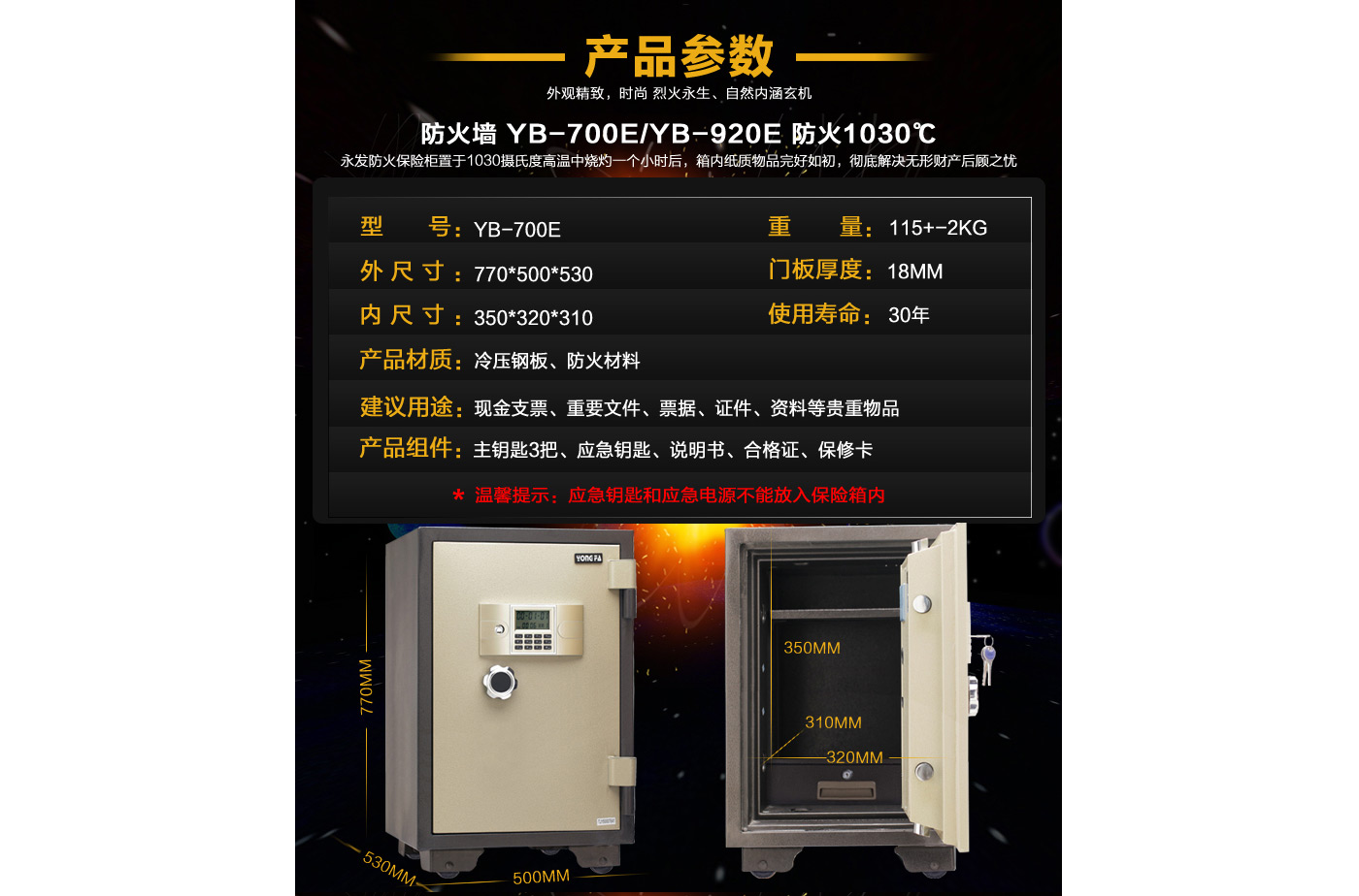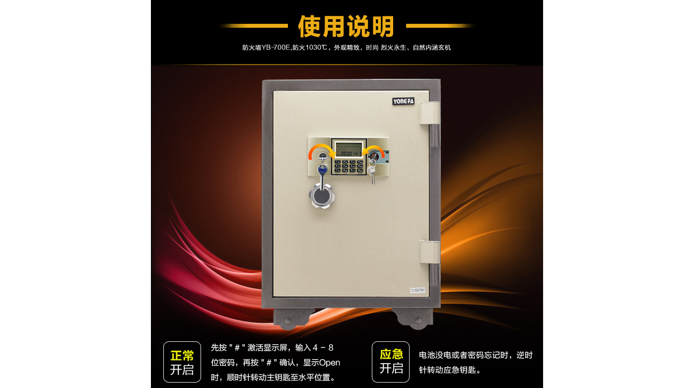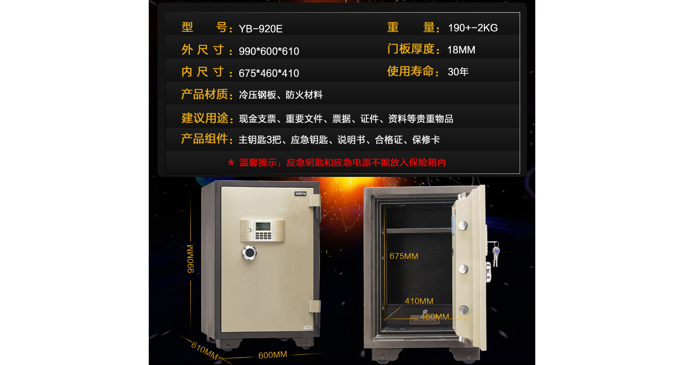 永發(fā)電子防火柜YB-700E尺寸說明:770高*500寬*530深mm(含底座) 重量:115kg