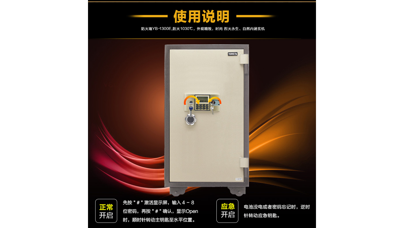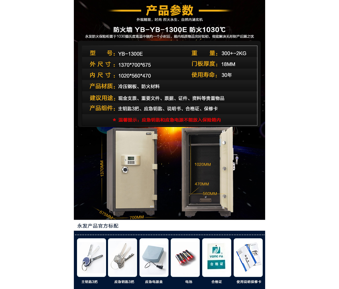 永發(fā)電子防火柜YB-1300E尺寸說明:1370高*700寬*675深mm(含底座) 重量:300kg