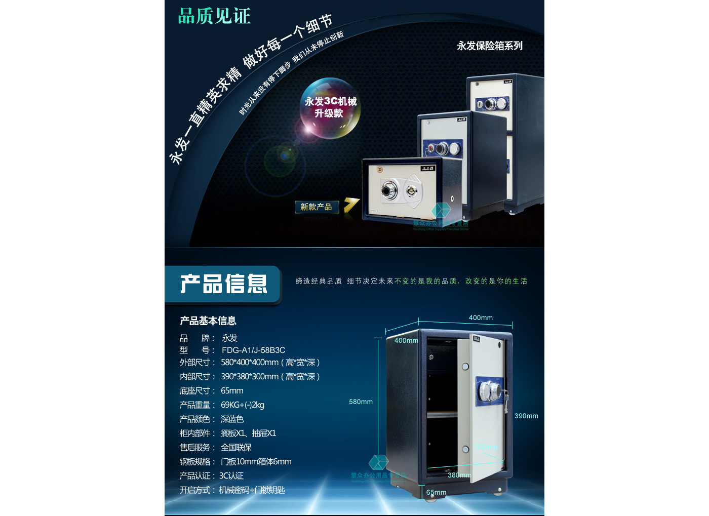 永發(fā)經(jīng)典機(jī)械系列3C認(rèn)證保險(xiǎn)箱J-58B3C尺寸說明:650高*400寬*400深mm(含底座) 重量:69kg