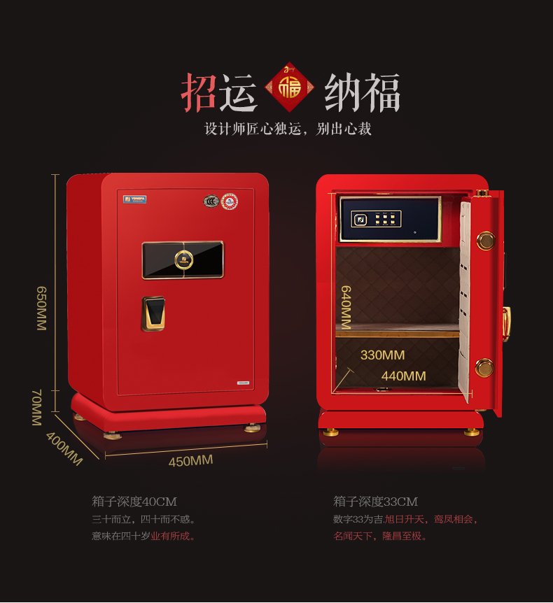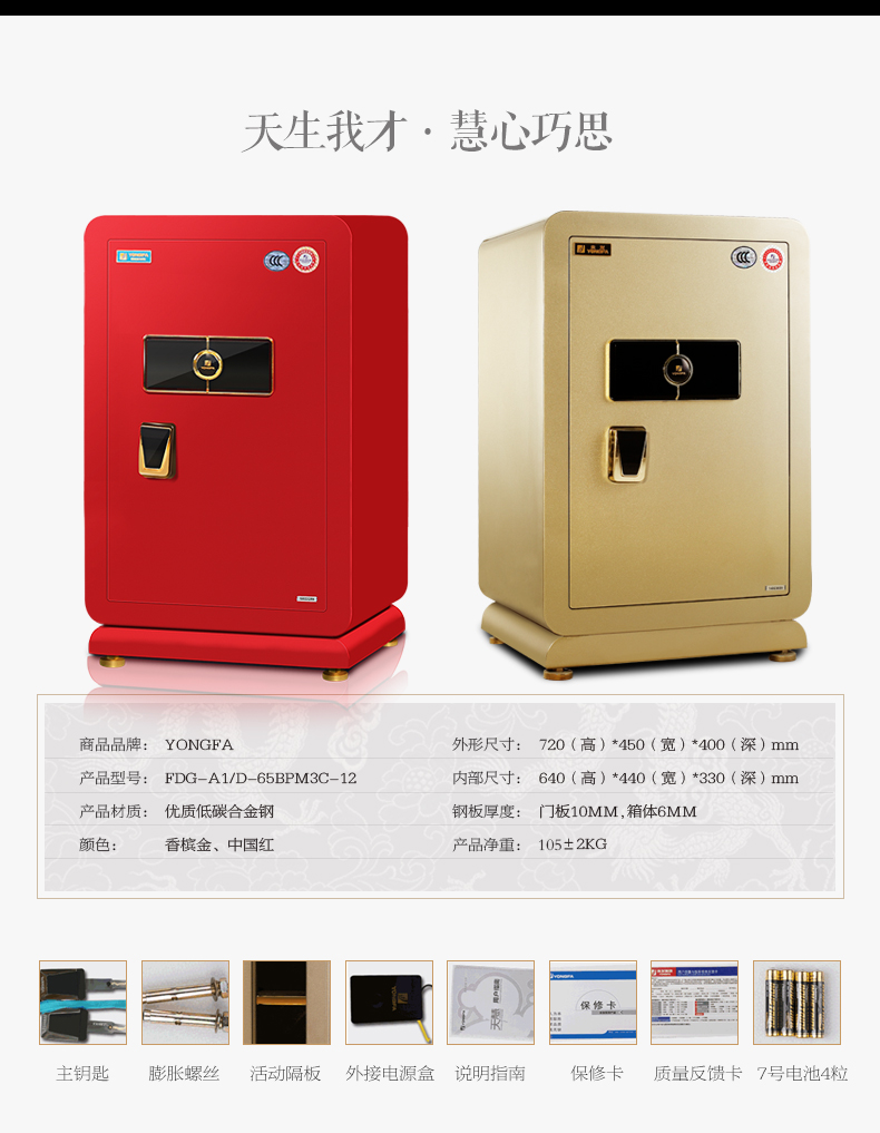 永發(fā)天慧系列指紋式3C保險(xiǎn)柜65BPM3C-12尺寸說(shuō)明:720高*450寬*400深mm(含底座) 重量:105kg