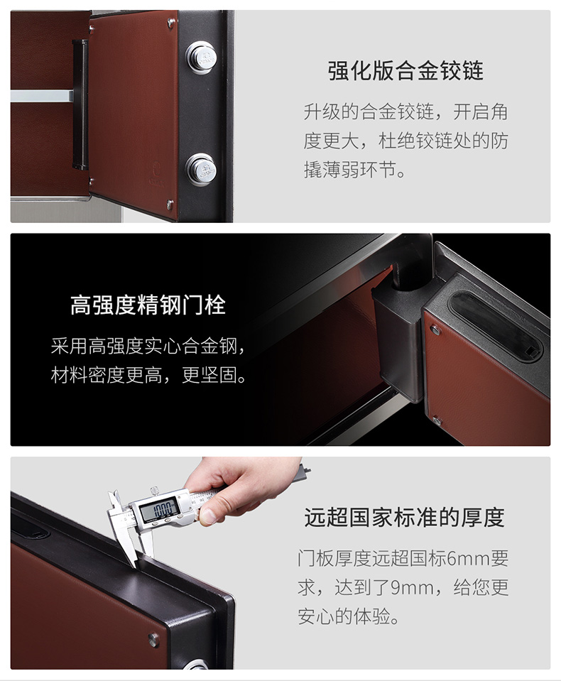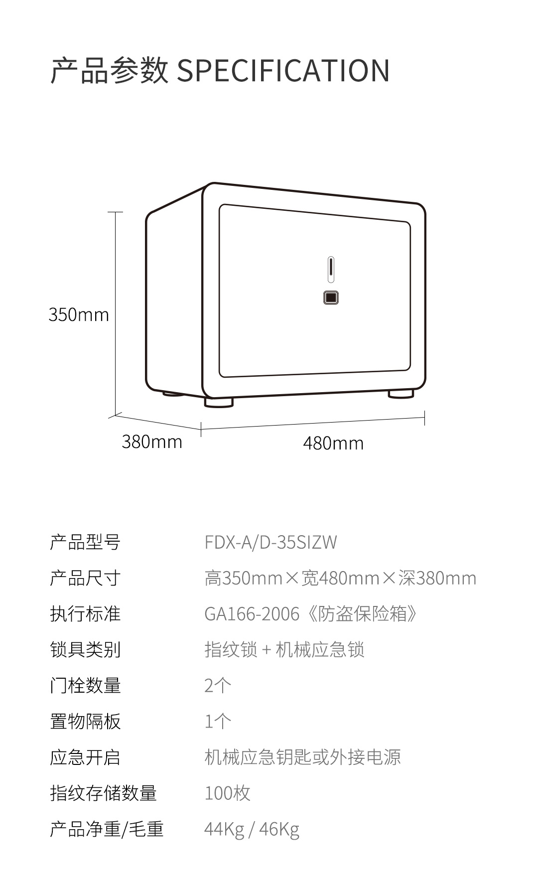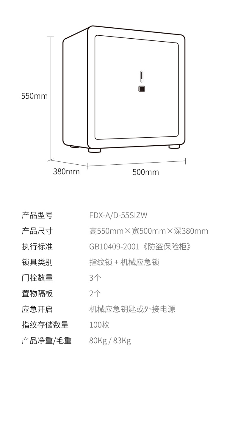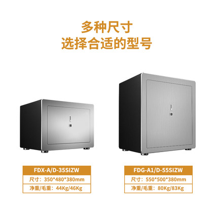 卡嘜安諾指紋系列3C認(rèn)證保險(xiǎn)箱D-35SIZW尺寸說(shuō)明:350高*480寬*380深mm(含底座) 重量:46kg