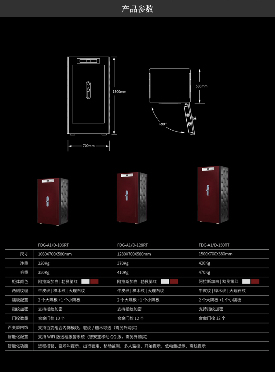 卡嘜御寶系列頂級3C認(rèn)證保險箱D-150RT尺寸說明:1500高*700寬*580深mm(含底座) 重量:420kg